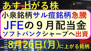 あす上がる株 2024年8月26(月)に上がる銘柄。小泉進次郎氏とサル痘関連銘柄。JFEホールディングスの9月高配当。ソフトバンクがシャープに出資~最新の日本株情報。高配当株の株価やデイトレ情報も~