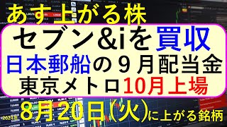 あす上がる株 2024年8月23(金)に上がる銘柄。ソフトバンクの9月配当金。JTがベクターを買収。9月株式分割。FOMC議事録。円高メリット銘柄~最新の日本株情報。高配当株の株価やデイトレ情報も~