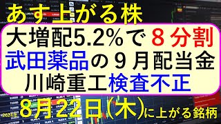 あす上がる株 2024年8月22(木)に上がる銘柄。川崎重工が船舶エンジンで検査不正。武田薬品の9月配当金~最新の日本株情報。高配当株の株価やデイトレ情報も~