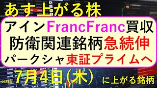 あす上がる株 2024年7月4日(木)に上がる銘柄。FrancFrancをアインが買収。パークシャ東証プライムへ。防衛関連株がトランプ有利で急続伸~最新の日本株情報。高配当株やデイトレ情報も~