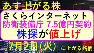 あす上がる株 2024年7月2日(火)に上がる銘柄。さくらインターネットが防衛装備庁。株探が値上げ。海運株が好調。ネクステージが下方修正。ENECHANGEが上場廃止か~高配当株やデイトレ情報も~