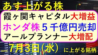 あす上がる株 2024年7月3日(水)に上がる銘柄。霞ヶ関キャピタルが増益。ホンダ株の売却。アールプランナーが増配~最新の日本株情報。高配当株やデイトレ情報も~