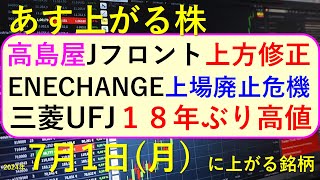 あす上がる株 2024年7月1日(月)に上がる銘柄。高島屋とJフロントリテイリングが上方修正。三菱UFJ18年ぶり高値。ENECHANGEが上場廃止危機~高配当株やデイトレ情報も~