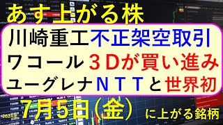 あす上がる株 2024年7月5日(金)に上がる銘柄。川崎重工が不正な架空取引で急落。ユーグレナがNTTと世界初。ワコールを3Dが買い進み。~最新の日本株情報。高配当株やデイトレ情報も~