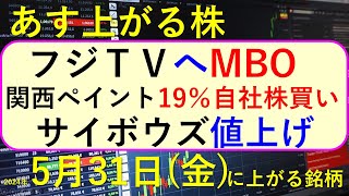 あす上がる株 2024年5月31日(金)に上がる銘柄 フジメディアへのMBO、サイボウズの値上げ、関西ペイントの自社株買い~最新の日本株での株式投資。高配当株やデイトレ情報も~