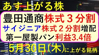 あす上がる株 2024年5月30日(木)に上がる銘柄 豊田通商が株式分割。三菱重工、三菱電機が急落、第一屋製パンが大増益。サイジニアが株式分割~最新の日本株での株式投資。高配当株やデイトレ情報も~