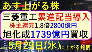あす上がる株 2024年5月29日(水)に上がる銘柄 三菱重工が累進配当を導入、旭化成がスウェーデン製薬企業を買収~最新の日本株での株式投資。高配当株やデイトレ情報も~