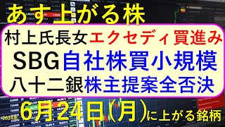 あす上がる株 2024年6月24日(月)に上がる銘柄。ソフトバンクグループの株主総会と株価。~最新の日本株での株式投資。高配当株やデイトレ情報も~