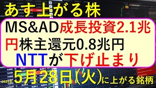 あす上がる株 2024年5月28日(火)に上がる銘柄 MS&ADの株主還元、NTTの下げ止まり~最新の日本株での株式投資。高配当株やデイトレ情報も~