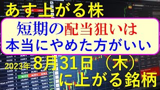 あす上がる株 2023年8月31日(木)に上がる銘柄 ~最新の日本株での株式投資のお話です。初心者でも! 高配当株の権利落ちと三菱重工~