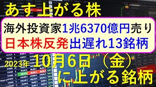 あす上がる株 2023年10月6日(金)に上がる銘柄 ~最新の日本株での株式投資のお話です。初心者でも! 海外投資家1兆6370億円売り、日本株反発で出遅れ13銘柄。~