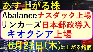 あす上がる株 2024年6月27日(木)に上がる銘柄。Abalanceのナスダック上場。キオクシアが上場。マイクロン テクノロジー決算~最新の日本株での株式投資。高配当株やデイトレ情報も~