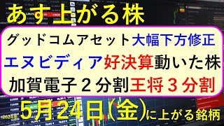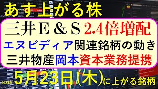 あす上がる株 2024年5月23日(木)に上がる銘柄 NVIDIAの決算とエヌビディア関連銘柄。三井E&S、三井物産、大塚。SHIFTの株価。~最新の日本株での株式投資。高配当株やデイトレ情報も~