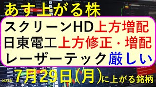 あす上がる株 2024年7月29日(月)に上がる銘柄。信越化学、スクリーン、大塚、日東電工、エムスリー、ペルセウスプロテオミクス、日立建機の決算~最新の日本株情報。高配当株の株価やデイトレ情報も~