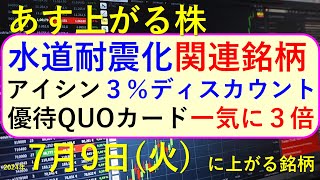 あす上がる株 2024年7月9日(火)に上がる銘柄。水道耐震化の関連銘柄。アイシン株の売り出し価格が決定。ウエルシアとフジの決算と株価~最新の日本株情報。高配当株やデイトレ情報も~