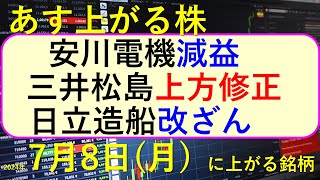 あす上がる株 2024年7月8日(月)に上がる銘柄。安川電機と三井松島の決算。日立造船が改ざん。~最新の日本株情報。高配当株やデイトレ情報も~