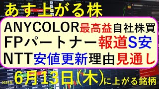 あす上がる株 2024年6月13日(木)に上がる銘柄。ANYCOLORの決算。NTTが安値更新。FPパートナーの報道。エニーカラーの株価など。~最新の日本株での株式投資。高配当株やデイトレ情報も~