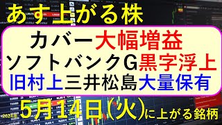あす上がる株 2024年5月14日(火)に上がる銘柄 ~最新の日本株での株式投資。ソフトバンクグループ、カバー、スズキ、三井松島、スクウェア・エニックスの決算と株価。高配当株やデイトレ情報も~