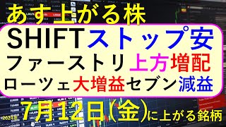 あす上がる株 2024年7月12日(金)に上がる銘柄。SHIFT、ファーストリテイリング、セブン&アイ、ローツェ、Sansan、タマホームの決算~最新の日本株情報。高配当株の株価やデイトレ情報も~