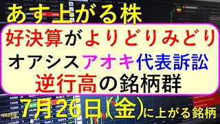 あす上がる株 2024年7月26日(金)に上がる銘柄。ルネサス、日産、キヤノン、中外製薬、富士通、富士電機、伊勢化学、野村不動産の決算。~最新の日本株情報。高配当株の株価やデイトレ情報も~