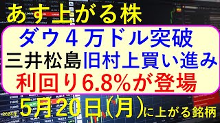 あす上がる株 2024年5月20日(月)に上がる銘柄 信越化学の自社株買い、住石の連騰、MS&AD、東京海上、SOMPOが決算予定、三井松島~最新の日本株での株式投資。高配当株やデイトレ情報も~