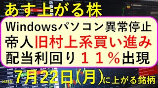 あす上がる株 2024年7月22日(月)に上がる銘柄。Windowsパソコンの異常停止。ディスコが決算で急落。帝人を旧村上系。配当利回り11%超~最新の日本株情報。高配当株の株価やデイトレ情報も~