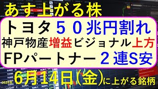 あす上がる株 2024年6月14日(金)に上がる銘柄。トヨタが50兆円割れ。神戸物産、ビジョナル、マクビー決算と株価。FPパートナーが。~最新の日本株での株式投資。高配当株やデイトレ情報も~