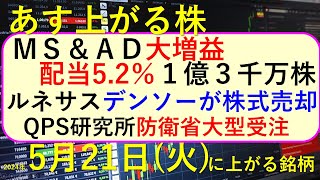 あす上がる株 2024年5月21日(火)に上がる銘柄 MS&AD、東京海上、SOMPOの決算。日本KFC、ルネサスエレクトロニクス、QPS研究所~最新の日本株での株式投資。高配当株やデイトレ情報も~