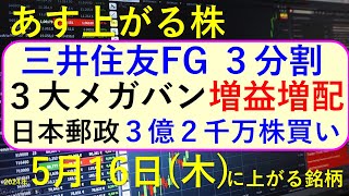 あす上がる株 2024年5月16日(木)に上がる銘柄 三菱UFJ、三井住友、みずほ、三菱HCキャピタル、リクルート、日本郵政、住石の決算と株価。~最新の日本株での株式投資。高配当株やデイトレ情報も~