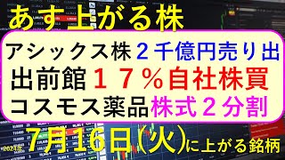 あす上がる株 2024年7月16日(火)に上がる銘柄。良品計画、アシックス、イオン、マネーフォワード、ELEMENTS、QPS研究所、出前館の決算~最新の日本株情報。高配当株の株価やデイトレ情報も~