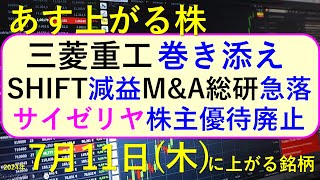 あす上がる株 2024年7月11日(木)に上がる銘柄。三菱重工が調査対象。SHIFTの決算は減益。サイゼリヤが決算で株主優待を廃止~最新の日本株情報。高配当株の株価やデイトレ情報も~