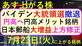 あす上がる株 2024年7月23日(火)に上がる銘柄。バイデン撤退で後継はハリス。円高メリット銘柄。日本郵船が増益に上方修正で海運株が好決算模様~最新の日本株情報。高配当株の株価やデイトレ情報も~