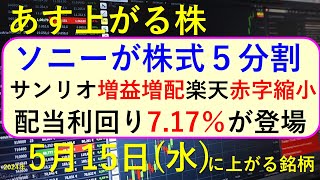 あす上がる株 2024年5月15日(水)に上がる銘柄 ソニー、サンリオ、楽天、三井E&S、ニトリ、りそな、電通、三越伊勢丹、出光興産の決算と株価。~最新の日本株での株式投資。高配当株やデイトレ情報も~