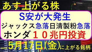 あす上がる株 2024年5月17日(金)に上がる銘柄 ジャックスと日清製粉が急落。ホンダの投資。ココナラの決算と株価。三井住友、三菱UFJ哀楽。~最新の日本株での株式投資。高配当株やデイトレ情報も~