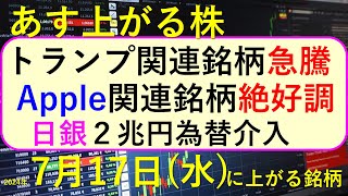 あす上がる株 2024年7月17日(水)に上がる銘柄。トランプ関連銘柄とアップル関連銘柄。日銀が介入。東宝とのFPパートナーの決算~最新の日本株情報。高配当株の株価やデイトレ情報も~