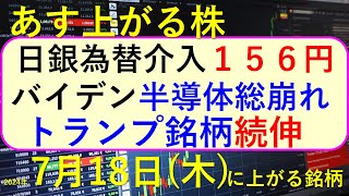 あす上がる株 2024年7月18日(木)に上がる銘柄。トランプ関連銘柄が続伸。日銀が為替介入。ASMLの決算。あすTSMC決算。バイデンが半導体株~最新の日本株情報。高配当株の株価やデイトレ情報も~