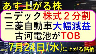 あす上がる株 2024年7月24日(水)に上がる銘柄。ニデックが決算で株式分割。三菱自動車とKOAが減益。古河電池がTOB。良品計画が値上げ。~最新の日本株情報。高配当株の株価やデイトレ情報も~