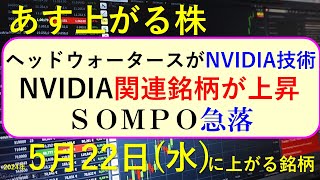 あす上がる株 2024年5月22日(水)に上がる銘柄 NVIDIAの決算でエヌビディア関連銘柄とヘッドウォータース。MS&AD、東京海上、SOMPO~最新の日本株での株式投資。高配当株やデイトレ情報