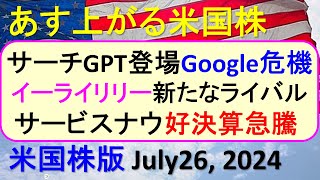 米国株の株式投資。オープンAI(OpenAI)がサーチGPT(SearchGPT)を試験展開。~あす上がる株米国版July 26, 2024。最新のアメリカ株価と株式投資。高配当株やデイトレ情報も