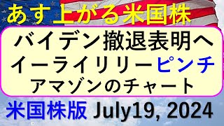 米国株の株式投資。バイデン大統領の選挙戦撤退報道。イーライリリーの肥満治療薬。アマゾンのチャート~あす上がる株米国版July 19, 2024。最新のアメリカ株価と株式投資。高配当株やデイトレ情報も