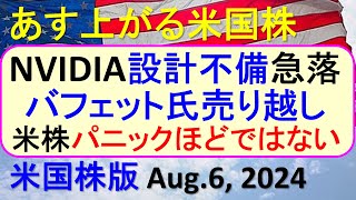 米国株の株式投資。ダウ続落、ISMはOK。エヌビディアが出荷遅延で下落。バフェット氏売り~あす上がる株米国版Aug. 6, 2024。最新のアメリカ株価と株式投資。高配当株やデイトレ情報も