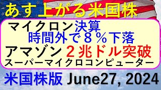 米国株の株式投資。マイクロンテクノロジーが決算で急落。アマゾンが2兆ドル。スーパーマイクロコンピューター~あす上がる株 米国版June 27, 2024~最新のアメリカ株価と株式投資。高配当株