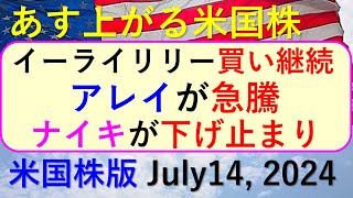 米国株の株式投資。イーライリリー、アレイテクノロジーズが好調。テスラが反発。ナイキの株価チャート~明日上がる株米国版July 14, 2024。最新のアメリカ株価と株式投資。高配当株やデイトレ情報も