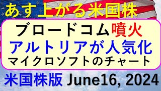 米国株の株式投資。エヌビディア、アップル、クラウドストライク、ブロードコム、アルトリア、テスラ~あす上がる株 米国版June 16, 2024~最新のアメリカ株での株式投資。高配当株やデイトレ情報も