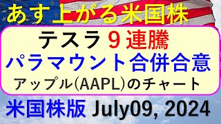 米国株の株式投資。テスラの株価が9連騰。パラマウントが合併。アップル(AAPL)の株価チャート~明日上がる株米国版July 9, 2024。最新のアメリカ株価と株式投資。高配当株やデイトレ情報も