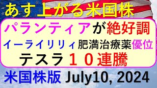 米国株の株式投資。パランティアが絶好調。テスラの株価が10連騰。イーライリリィが肥満治療薬で優位~明日上がる株米国版July 10, 2024。最新のアメリカ株価と株式投資。高配当株やデイトレ情報も