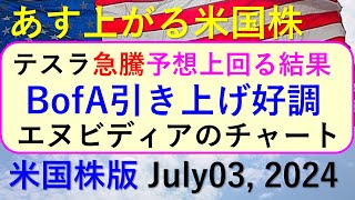 米国株の株式投資。テスラが予想上回る。バンクオブアメリカ引き上げ。エヌビディアのチャートNVIDIA~明日上がる株米国版July 3, 2024。最新のアメリカ株価と株式投資。高配当株やデイトレ情報も