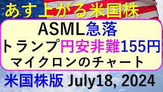 米国株の株式投資。ASML、TSMCが決算。トランプ氏と河野氏の発言で円高。マイクロンのチャート~あす上がる株米国版July 18, 2024。最新のアメリカ株価と株式投資。高配当株やデイトレ情報も