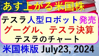 米国株の株式投資。テスラのヒューマノイドロボット「オプティマス」。グーグルとテスラの決算~あす上がる株米国版July 23, 2024。最新のアメリカ株価と株式投資。高配当株やデイトレ情報も