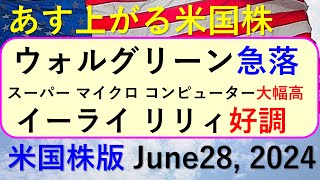 米国株の株式投資。ウォルグリーン急落。イーライ リリィ、スーパー マイクロ コンピューター好調~あす上がる株 米国版June 26, 2024~最新のアメリカ株価と株式投資。高配当株やデイトレ情報も